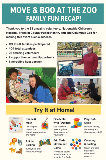 We had an amazing time Saturday 10/11 at the Columbus Zoo & Aquarium with our CCS Pre-K families!This special event was made possible through a continued partnership with the Columbus Zoo, along with support from Nationwide Children’s Hospital and Franklin County Public Health. Families enjoyed a morning filled with wildlife exploration, engaging activity stations, and helpful community resources.