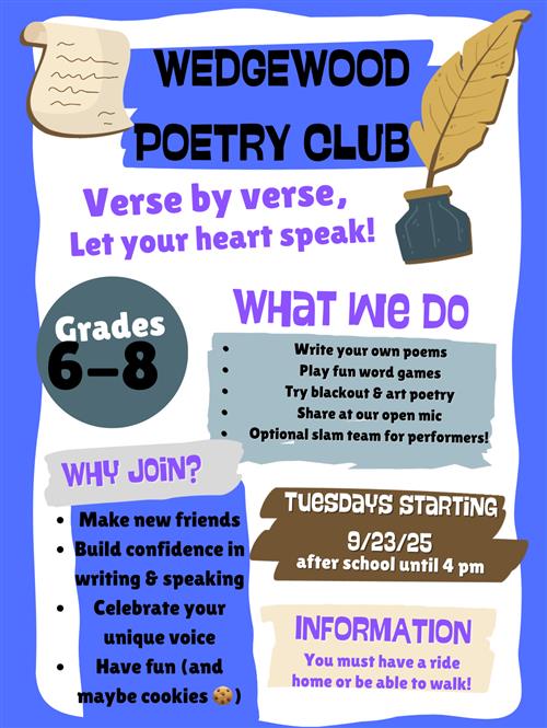 Wedgewood is excited to have Poetry club starting this year! Mrs. Brickman is leading our club and it will take place weekly after school until 4 pm. Meetings will be weekly on Tuesdays. If you are interested in joining ask at the office or talk to Mrs. Brickman!